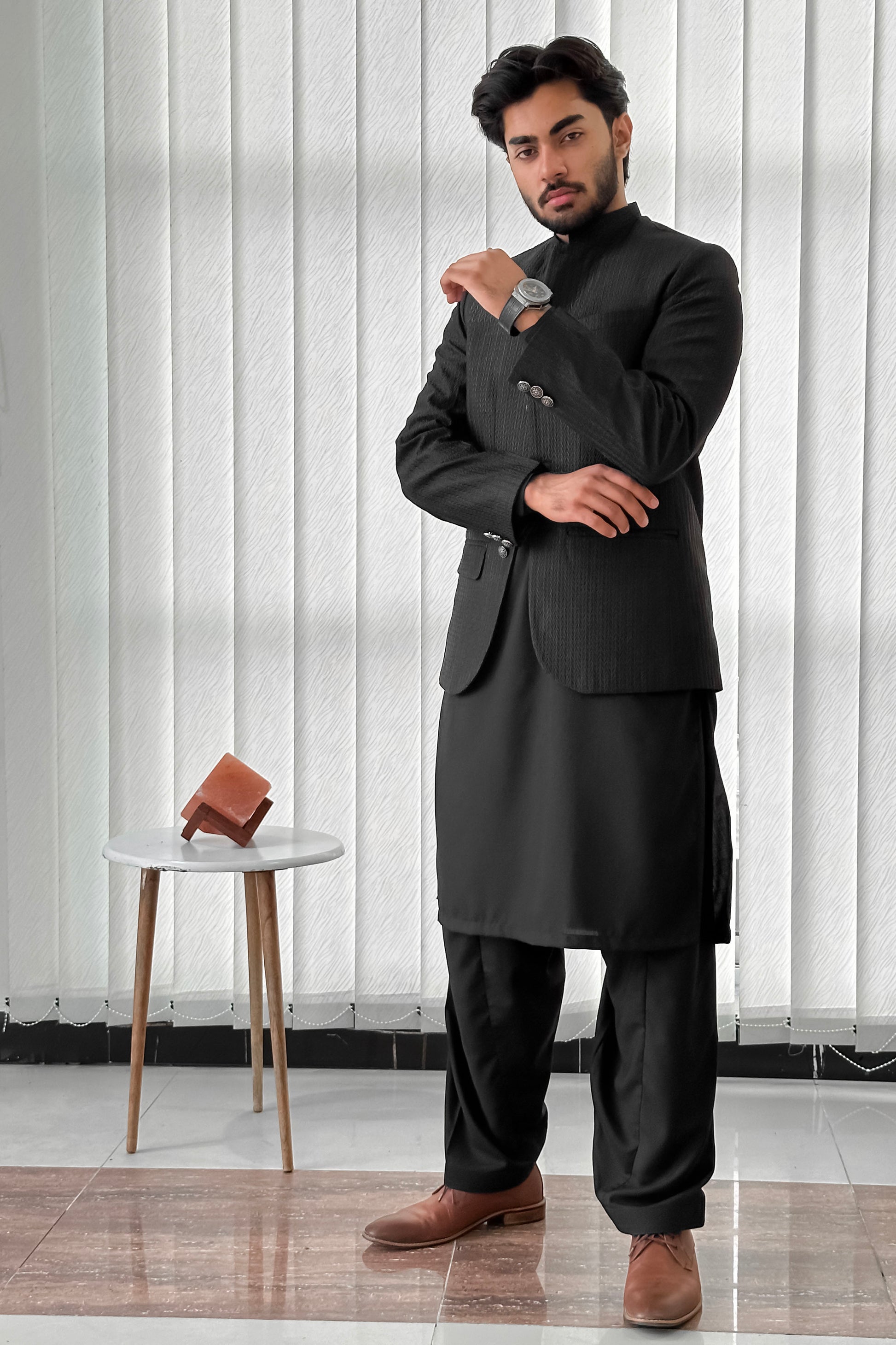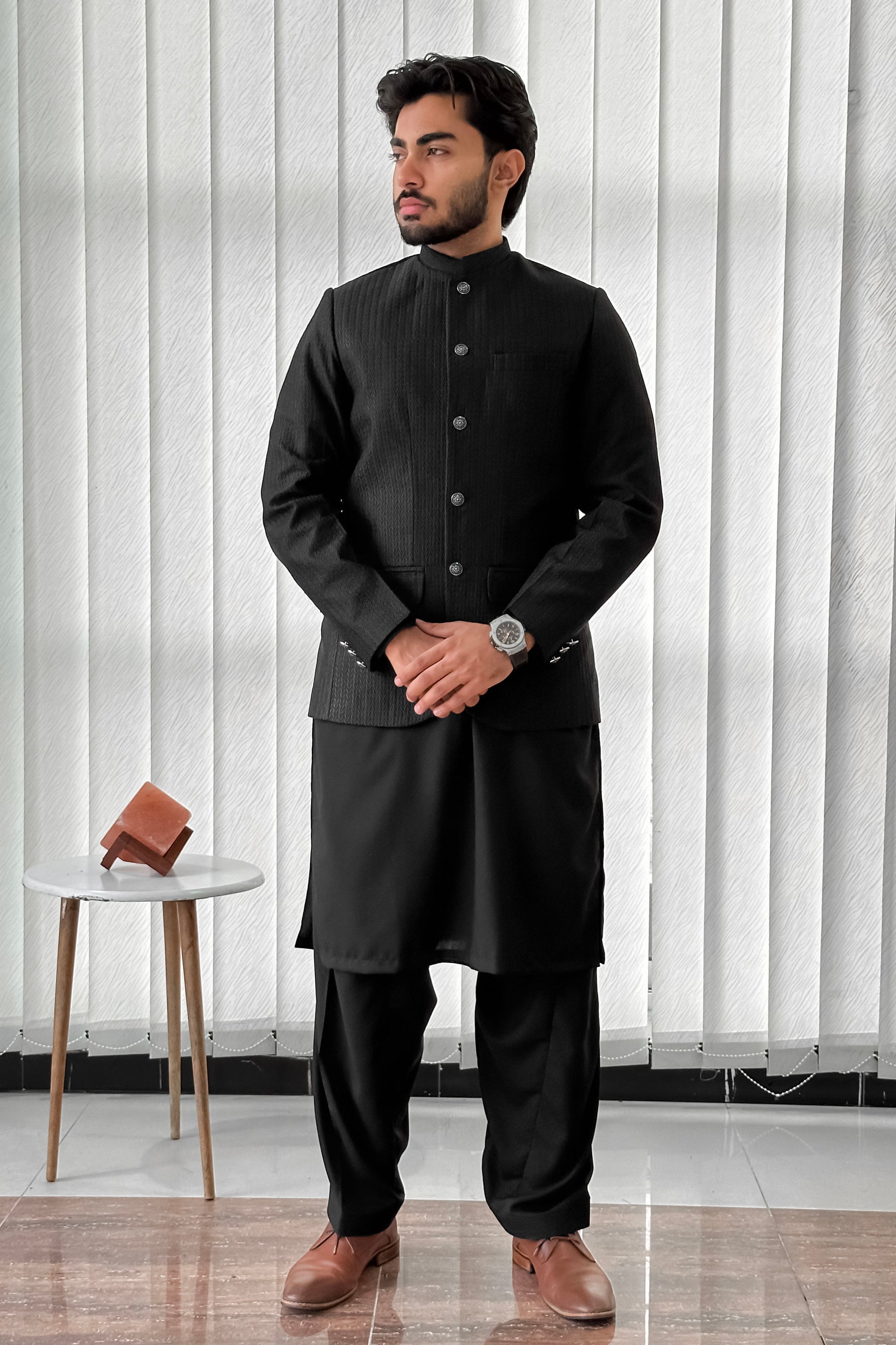 Black Kurta Shalwar with Embroidered Prince Coat - Men