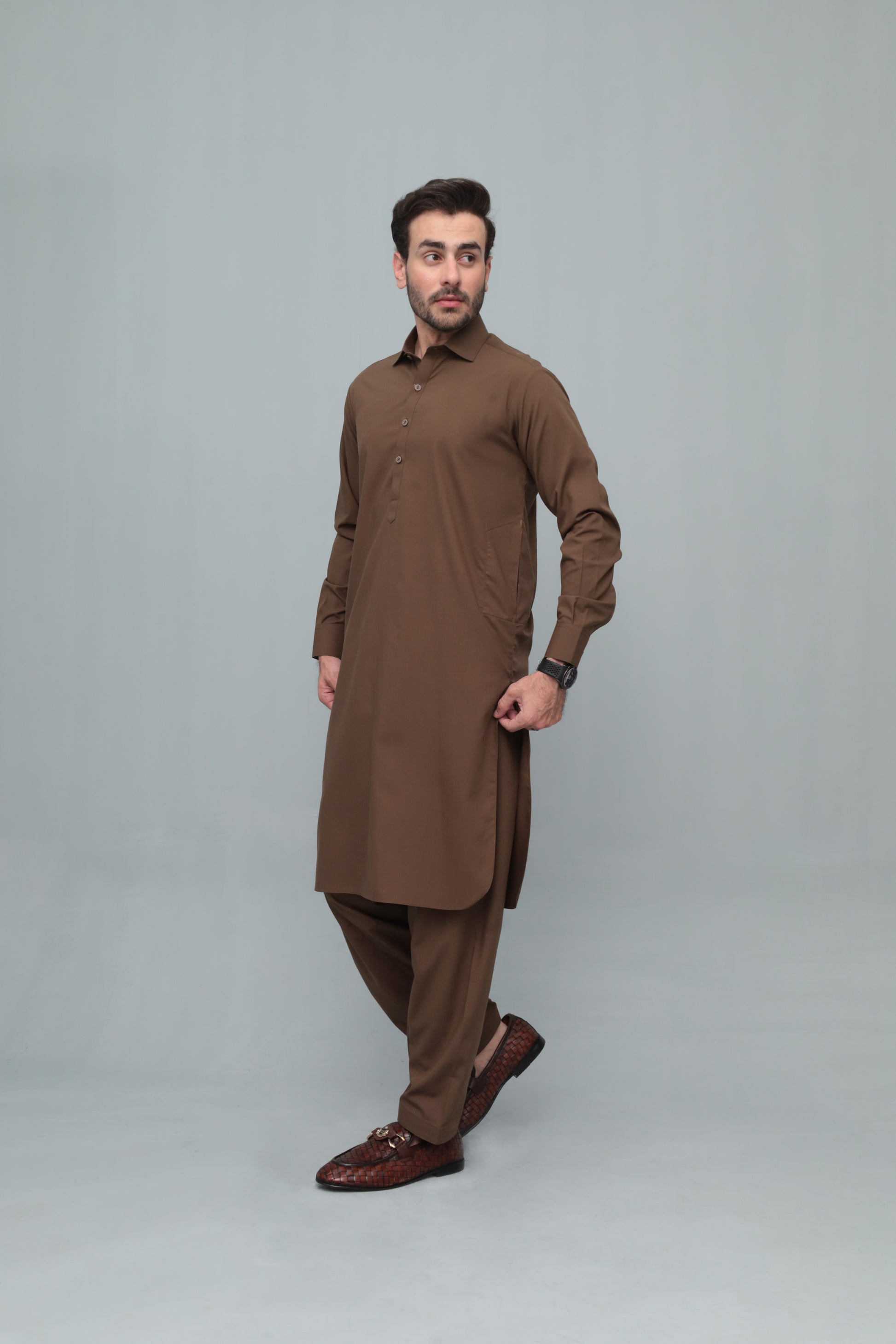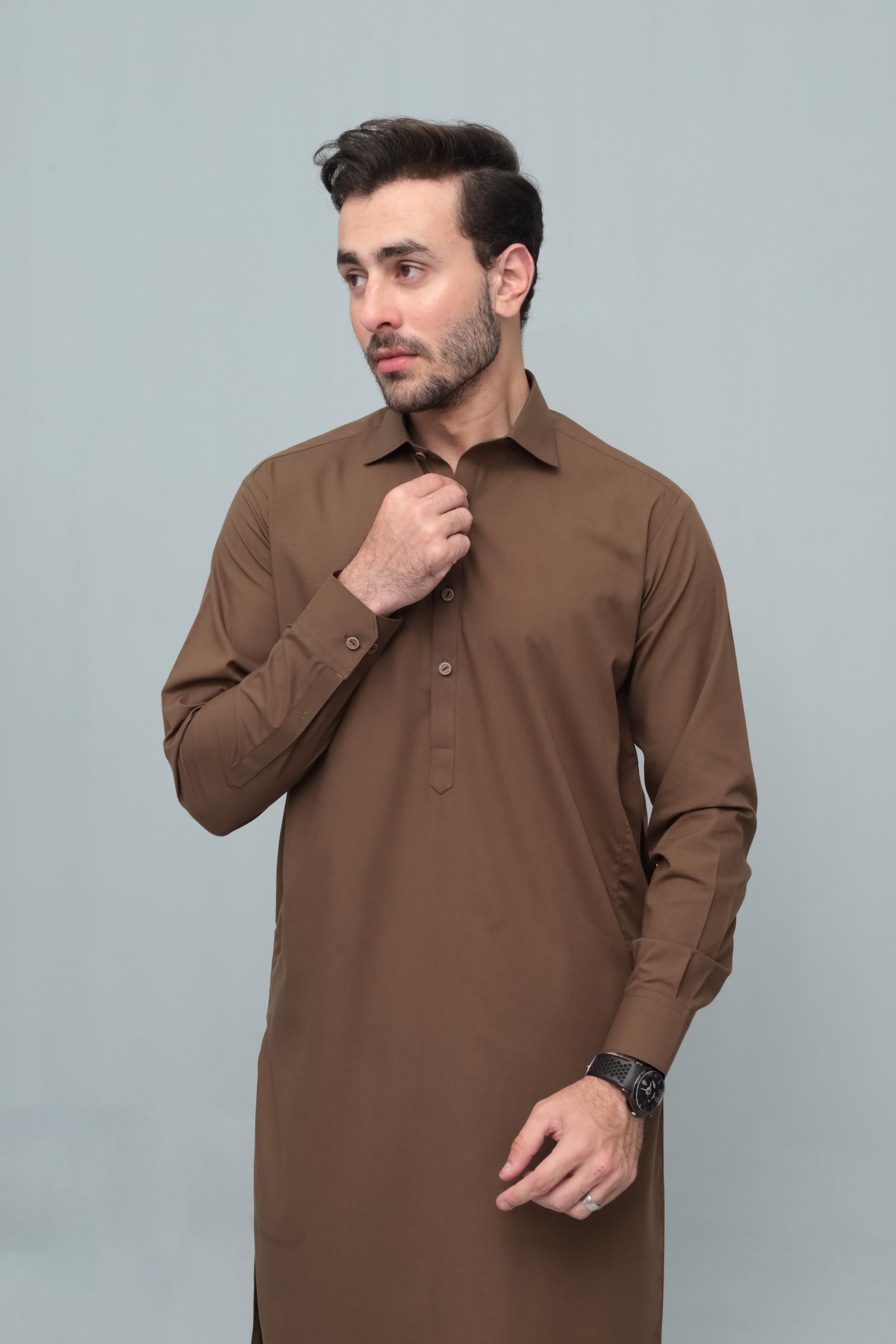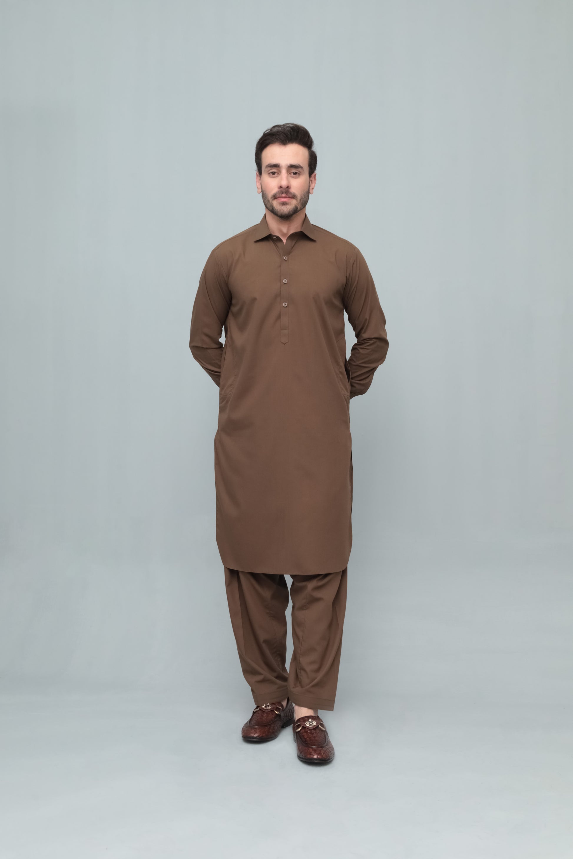 Coffee Brown French Collar Shalwar Kameez - Stitched