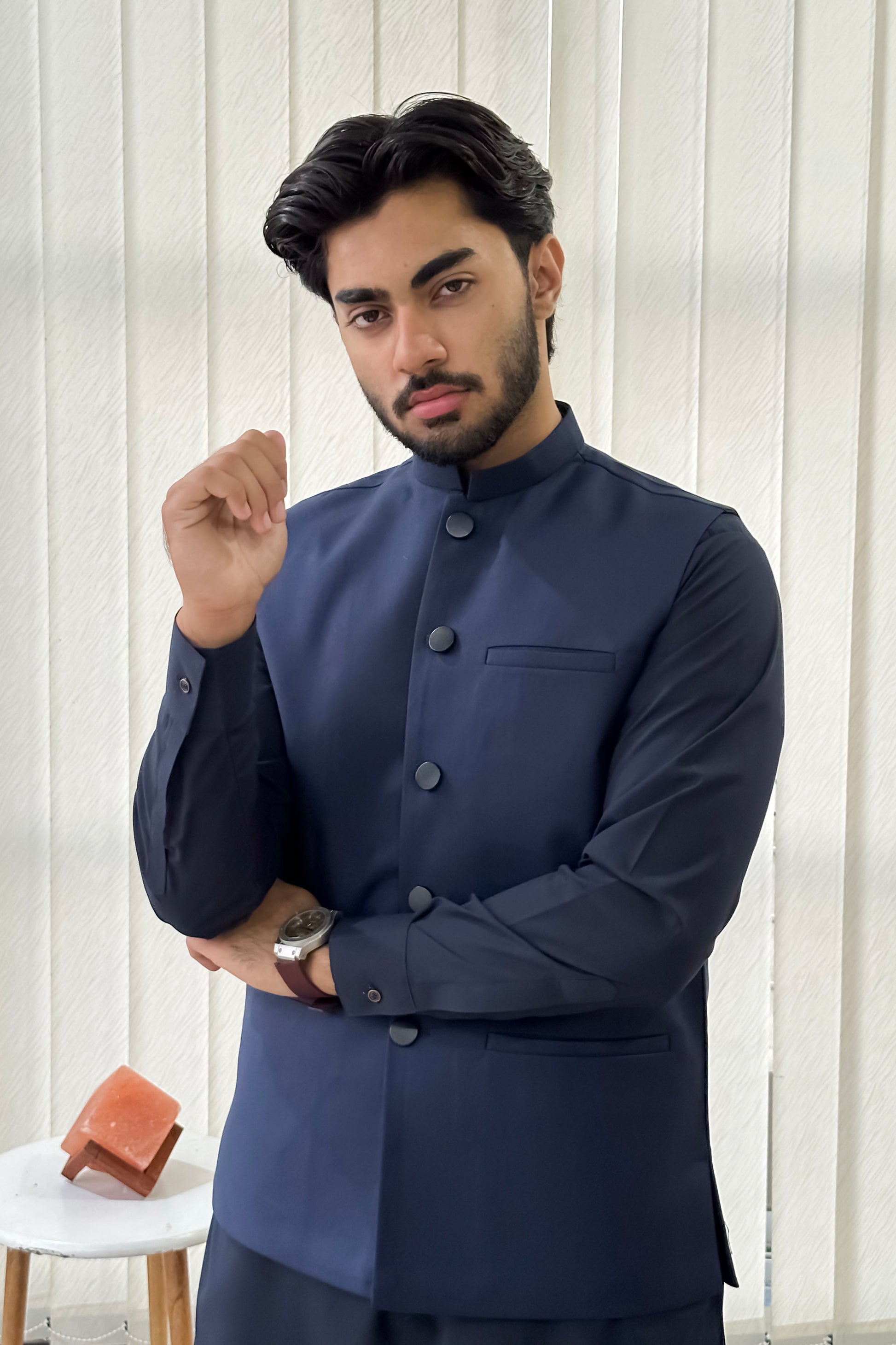 Navy Blue Kurta Shalwar with Suiting Waistcoat - Straight Cut - Men