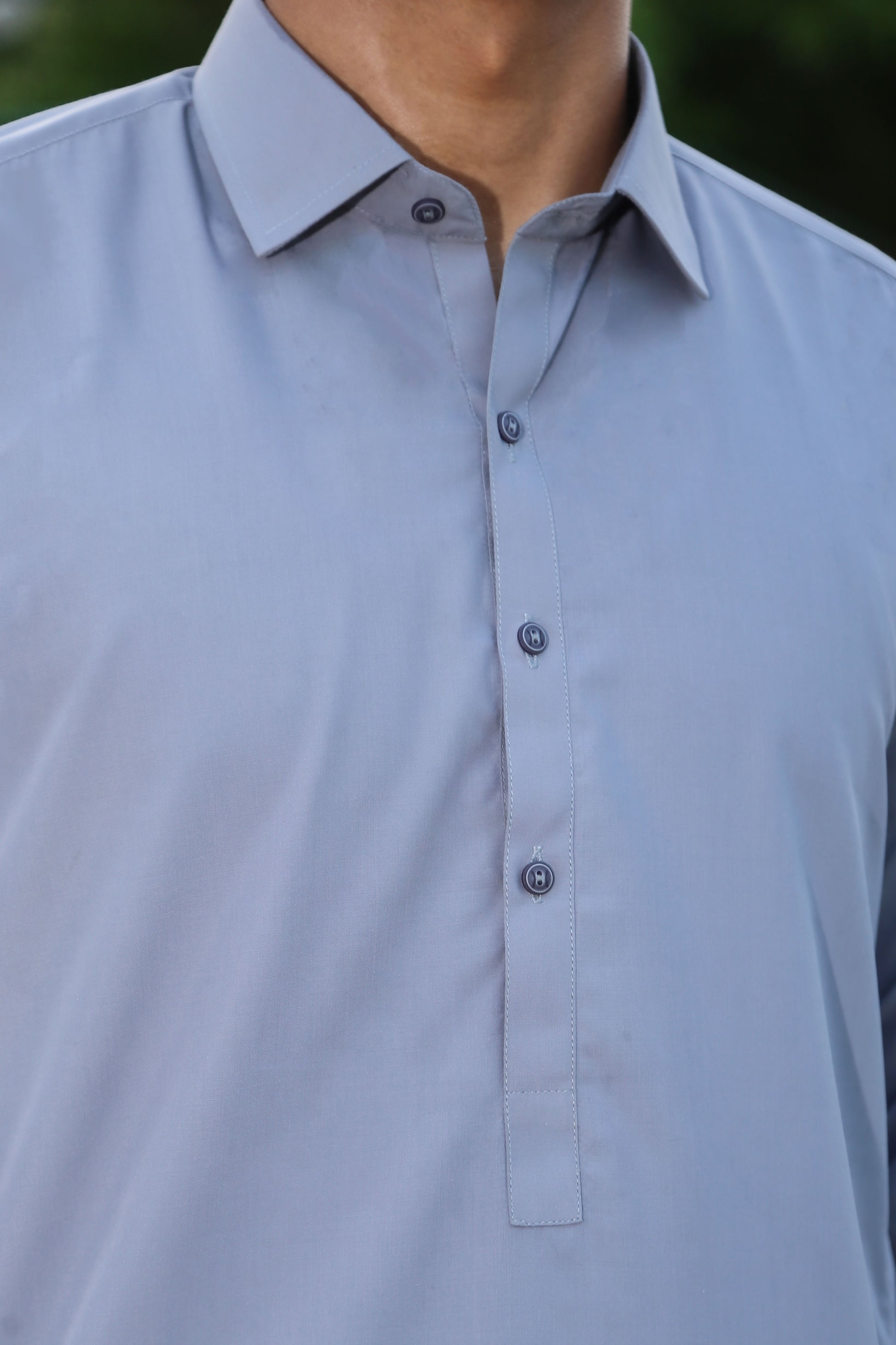 Silver Gray French Collar Shalwar Kameez - Stitched